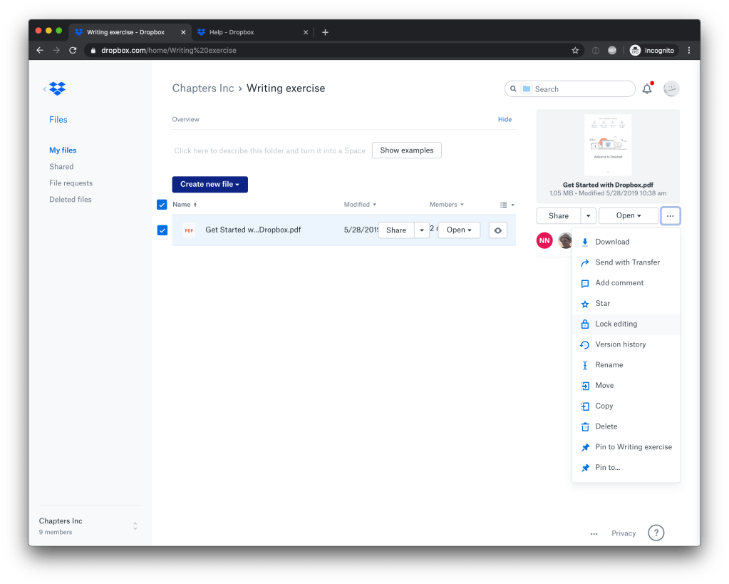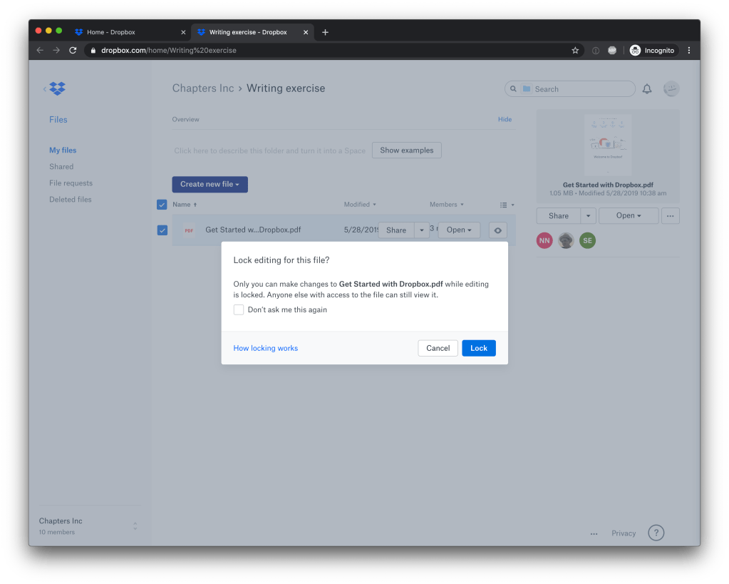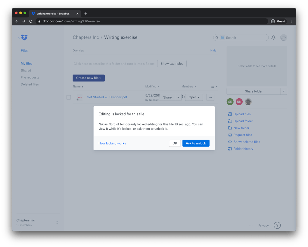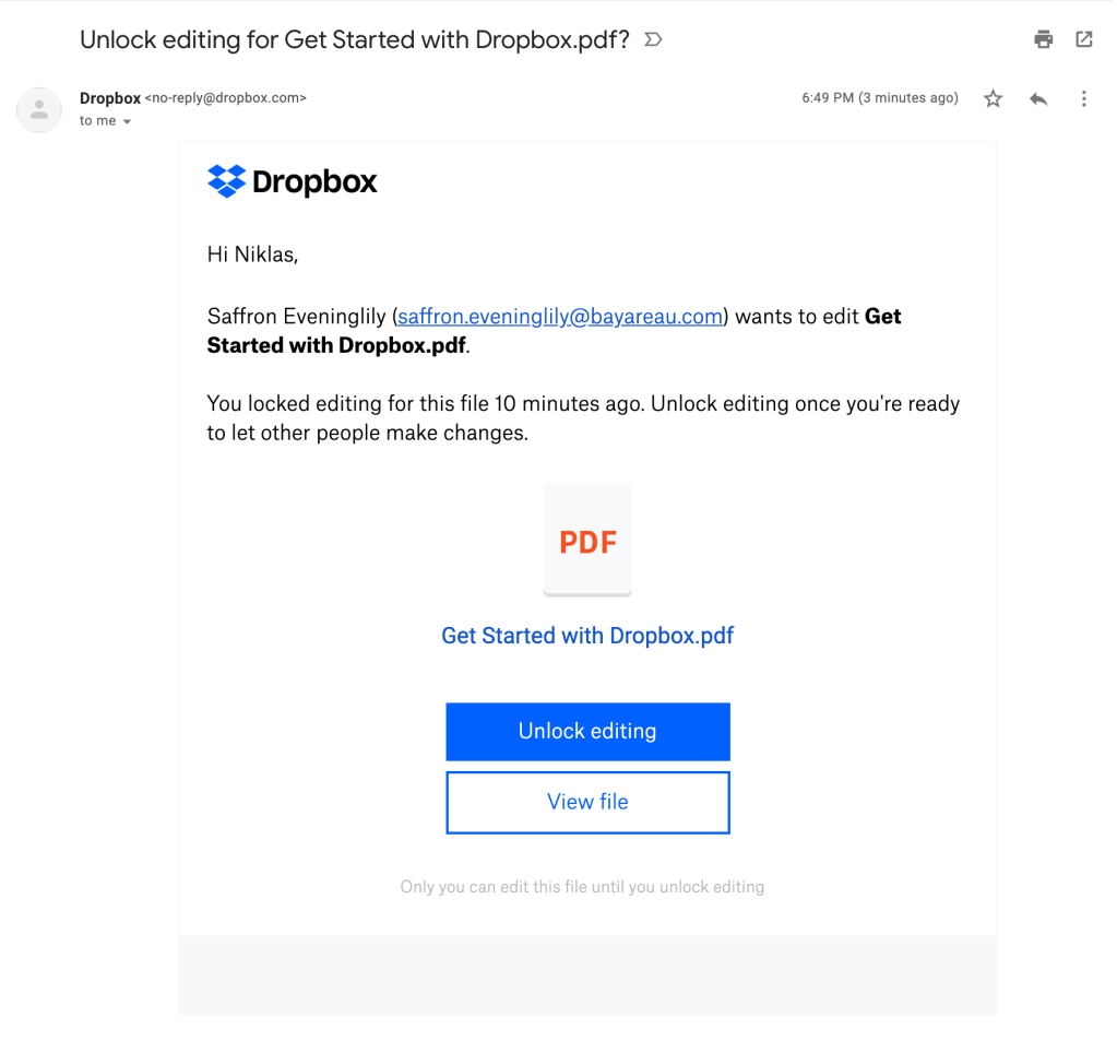 Notice “Lock editing” in that menu on the right. Once you click that option, we’ll show you a confirmation. I tried to highlight that this wasn’t locking down access—just editing.We’ll show you a little confirmation snackbar (as we call them) at the bottom.The opposite of “lock” is of course “unlock.” I know this sounds straightforward, but we did test out other options just to be sure this felt intuitive.And now folks can edit that file again. Great job remembering to unlock it. You’re a champ!But what about your coworker’s point of view (AKA the collaborator)? Let’s imagine you’ve come across a file someone else locked. Notice the tooltip. This is where those high-level decisions come into play.I mean you could talk to them in person. Sure that’s a thing some people do. But wouldn’t you rather send them a message through Dropbox? It turns out yes. Most people we interviewed would actually prefer to send a message through Dropbox.Okay, maybe you’re being a little impatient here. They locked it 10 seconds ago. You can view it. Isn’t that enough for now? Nope. You just went ahead and asked them to unlock. Okay. We’ll send them an email (and notifications to their desktop and mobile devices—not shown).So here’s that email. We didn’t want to be too pushy. I mean, this is your coworker.